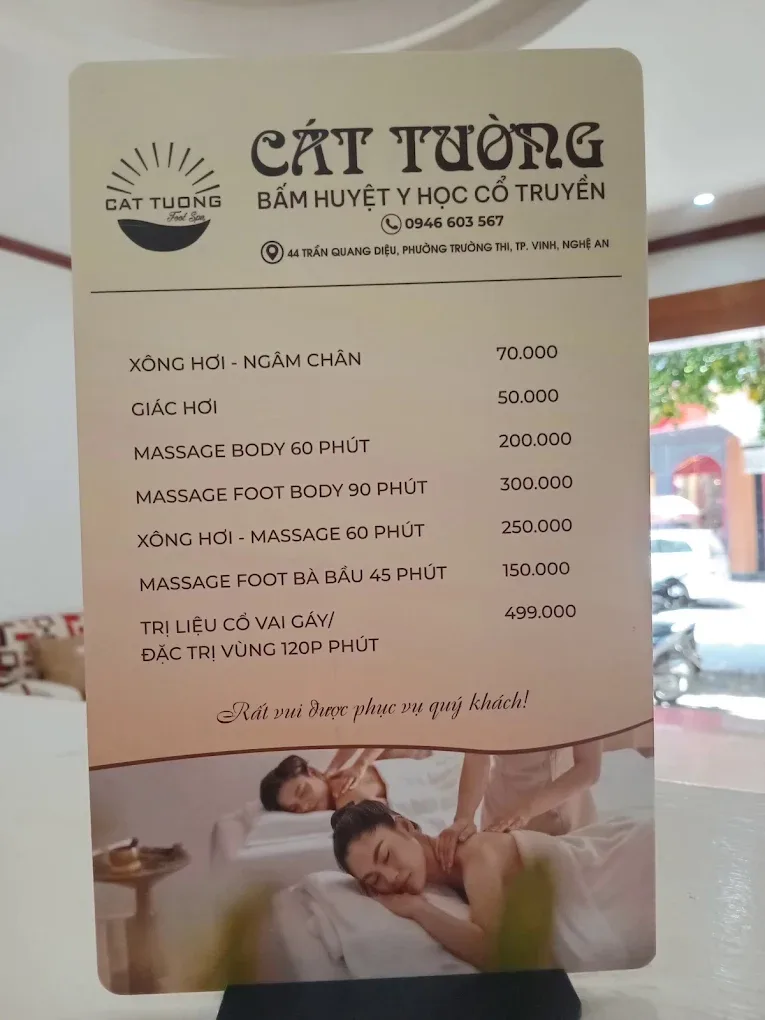 Cát Tường Foot Spa là một địa chỉ quen thuộc tại Vinh, được nhiều khách hàng tin tưởng lựa chọn để thư giãn và chăm sóc sức khỏe. Spa tập trung vào các liệu pháp massage chân, massage toàn thân, và xông hơi, mang đến không gian ấm cúng và dịch vụ tận tâm.