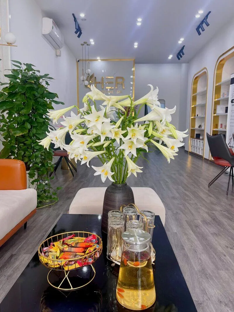 Không gian của Her Skincare & Spa Vinh được thiết kế theo phong cách hiện đại, tinh tế với tông màu chủ đạo là trắng và đen, tạo cảm giác nhẹ nhàng và thư thái cho khách hàng. Sự kết hợp với các chi tiết trang trí như hoa tươi và ánh sáng lung linh mang lại một tổng thể sang trọng nhưng không kém phần gần gũi.
