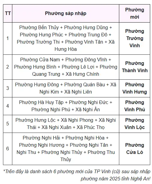 116. Sắp xếp toàn bộ diện tích tự nhiên, quy mô dân số của các phường Bến Thủy, Hưng Dũng, Hưng Phúc, Trung Đô, Trường Thi, Vinh Tân và xã Hưng Hòa thành phường mới có tên gọi là phường Trường Vinh.