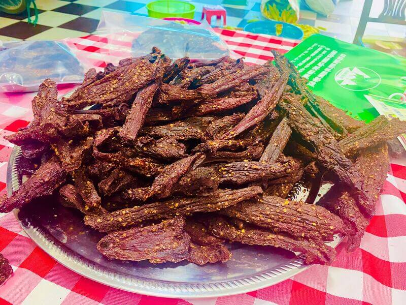 - Đặc điểm: Tinh hoa ẩm thực của người Thái. Những thớ thịt bò tươi ngon nhất được thái dọc, tẩm ướp đậm đà với gia vị núi rừng đặc trưng như mắc khén, hạt dổi, ớt rồi treo trên gác bếp hong khô bằng khói củi.