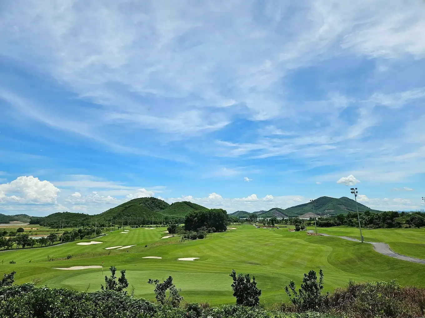 - Cảnh quan & Địa hình: Fairway được thiết kế uốn lượn theo sườn đồi tự nhiên, bao quanh là các hồ nước và thảm cỏ lau, tạo nên tầm nhìn thoáng đãng và đẹp mắt.