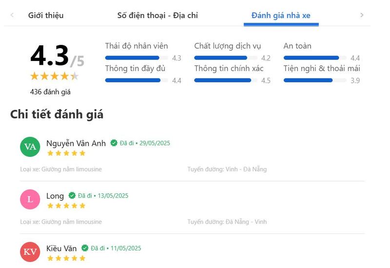 Trên Vexere.com, nhà xe đạt điểm trung bình 4.3/5 dựa trên 436 lượt đánh giá, thể hiện sự hài lòng cao từ hành khách. Khách hàng đặc biệt khen ngợi chất lượng xe với nội thất sạch sẽ, không gian thoải mái cùng với thái độ phục vụ chuyên nghiệp và nhiệt tình của nhân viên.