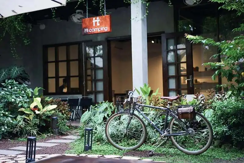 Hi Camping là một "tọa độ chill" nép mình trong con ngõ nhỏ, mang đến cảm giác bình yên ngay từ chiếc cổng gỗ mộc mạc. Khoảng sân rộng rãi phủ ngập cây xanh và hoa lá tạo nên bầu không khí mát mẻ, dễ chịu. Decor tại đây rất "nghệ" với chất liệu gỗ thân thiện môi trường và những lọ hoa mini xinh xắn, biến mọi góc nhỏ đều trở thành nơi thư giãn lý tưởng.