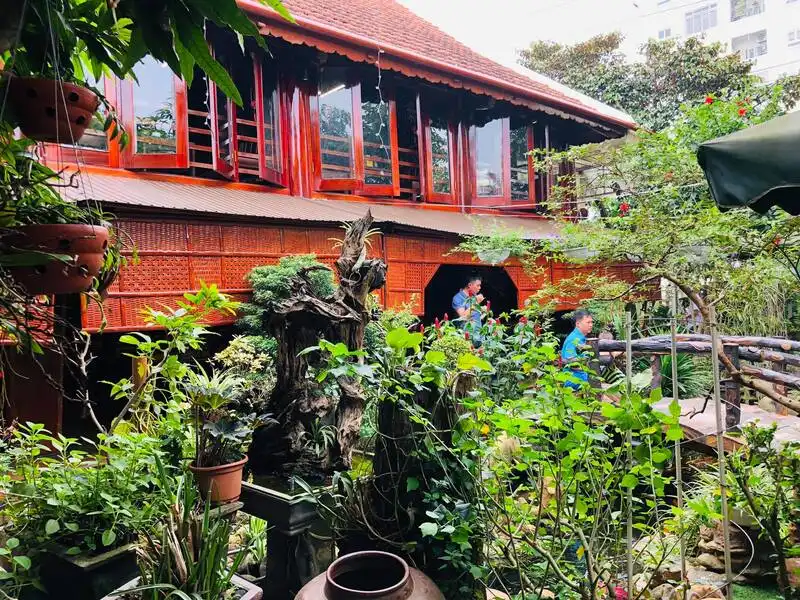 Cafe Điện Ảnh II mang đến một trải nghiệm khác biệt với kiến trúc nhà gỗ mái ngói hoài niệm nằm giữa vườn cây xanh mát. Điểm nhấn đặc biệt giúp điều hòa không khí tại đây chính là khuôn viên có hồ bơi nhỏ, tạo cảm giác mát mẻ và sinh động quanh năm.