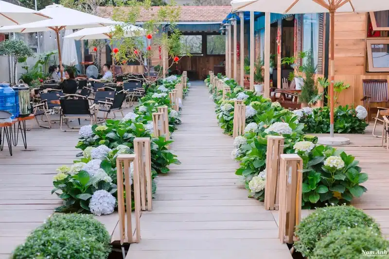 An Nhiên Coffee nổi tiếng với không gian ngập tràn cây xanh và con đường hoa cẩm tú cầu rực rỡ. Vẻ đẹp lãng mạn nên thơ này tạo nên vô số góc check-in "ổn áp" cho các chị em theo phong cách "nàng thơ".