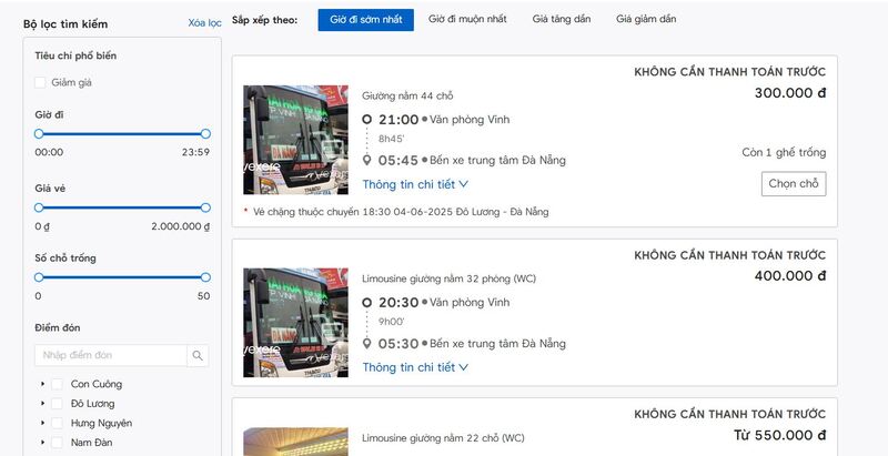 Hải Hoàng Gia hiện đang cung cấp nhiều khung giờ khởi hành linh hoạt trong ngày với các dòng xe limousine vinh đà nẵng hải hoàng gia và xe giường nằm truyền thống. Dưới đây là bảng cập nhật chi tiết về lịch trình, thời gian di chuyển, giá vé và tình trạng chỗ ngồi mới nhất để bạn dễ dàng lựa chọn chuyến đi phù hợp. Tất cả các chuyến đều không cần thanh toán trước, giúp bạn linh hoạt và an tâm hơn khi đặt vé.
